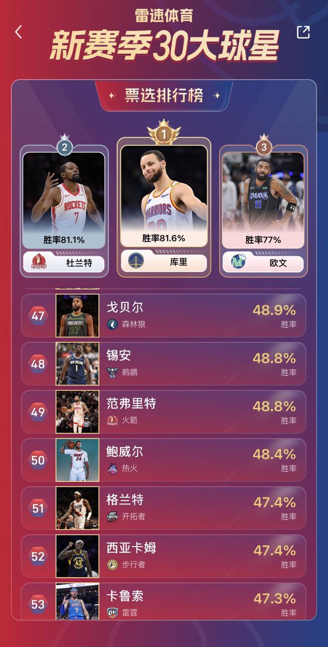 雷速NBA新賽季30大球星即時排名:庫裏反超KD升至第一