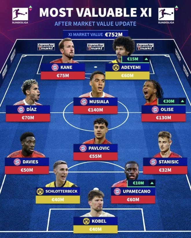 德國轉會市場盤點了最新身價更新後的德甲最貴陣容。拜仁與多特“包圍式”入選,穆西亞拉、奧利塞、凱恩等領銜鋒線與邊路,話題度瞬間拉滿——這套身價十一人,你認可嗎?數據截至:2025年10月15日。